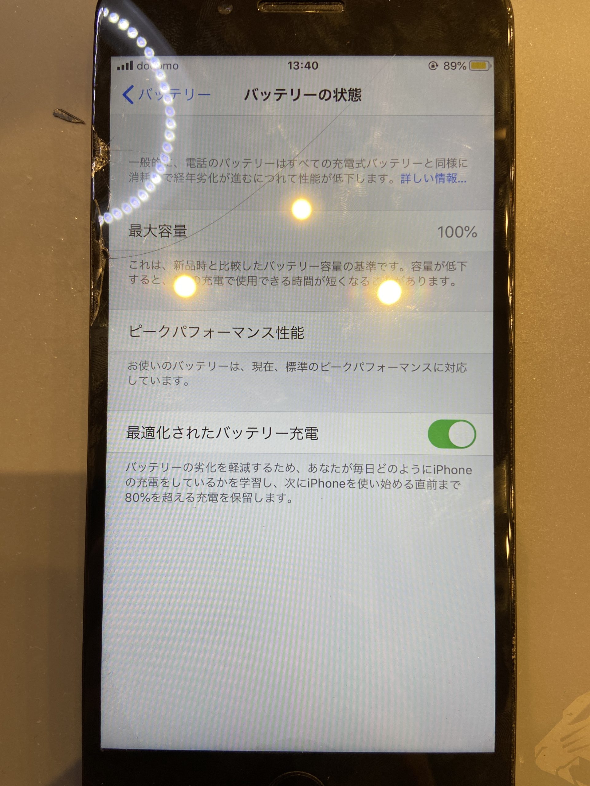 これは、iPhoneをフルで充電しても87%までしか充電されないということを示しています。大体80%代で充電の持ちが悪くなったり、電池がつかなくなるなどの経年劣化の症状が出始め、バッテリー交換をされる方が多いです。